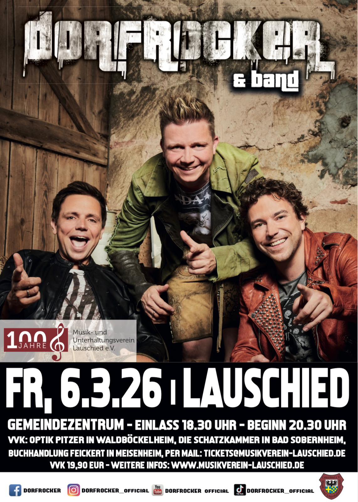 Jubiläumsrock DORFROCKER Datum März 06 2026 Abgelaufen! Uhrzeit 18:30 - 20:00 Preis 19,90€ Standort Lauschied - Gemeindezentrum Meisenheimerstraße 11, 55568 Lauschied Kategorie Event Teile diese Veranstaltung